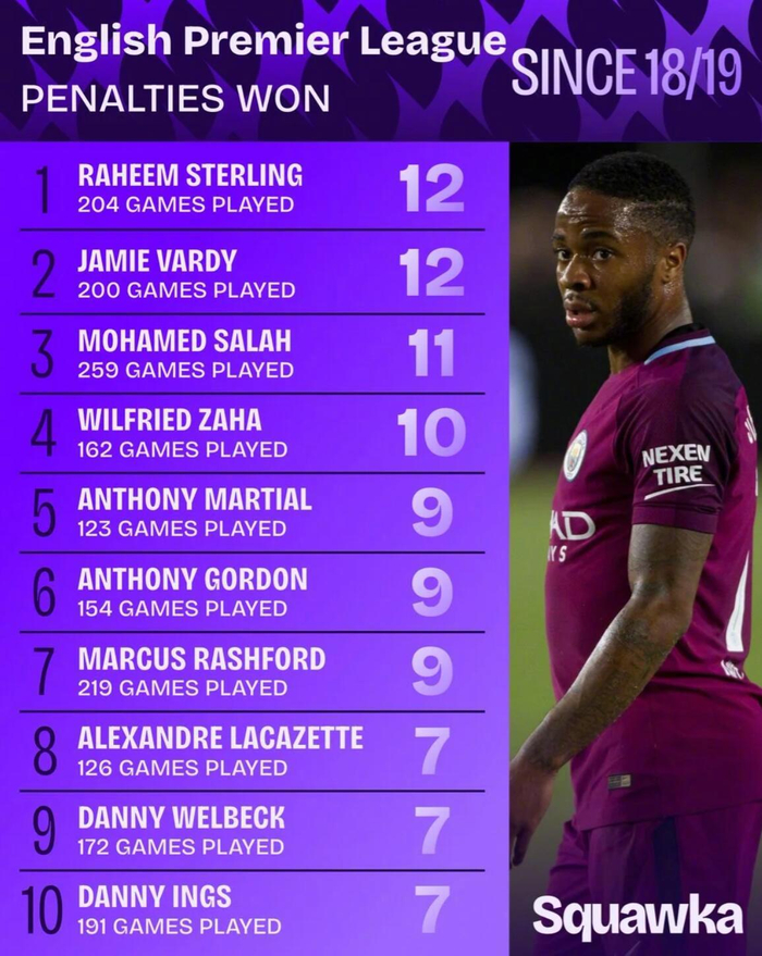 Squawka的数据显示自2018/19赛季开始,英超联赛中赢得点球次数最多的球员榜单已经出炉,斯特林和瓦尔迪以12次并列榜首,萨拉赫以11次紧随其后。